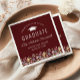 Uma bela borda floral de aquarelas enfeita a borda inferior desses guardanapos de festa de formatura de vassoura. As palavras "parabéns ao nosso formando" rodeiam uma silhueta de um boné tradicional de papelão. Personalize o texto branco em um fundo vermelho burgundy, com o nome do formando em script de escrita manual e o ano escolar e de aula em fontes sans serif.