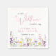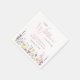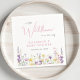 Elegant baby girl shower napkins featuring "a little wildflower is on her way" written in a blend of light grey typography and a stylish pink script, and boho-inspired whimsical watercolors of dainty purple, pink and yellow wildflowers. Add the name of the mother-to-be in simple pink lettering.