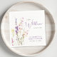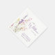 Elegant baby girl shower napkins featuring "a little wildflower is on her way" showcased in a blend of modern light grey typography and a whimsical purple script, and a boho-inspired watercolor bouquet of purple, pink and yellow wildflowers.