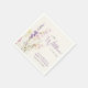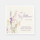 Elegant light cream baby girl shower napkins featuring "a little wildflower is on her way" showcased in a blend of modern grey typography and a whimsical purple script, and a boho-inspired watercolor bouquet of purple, pink and yellow wildflowers.