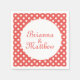 Estes guardanapos de papel branco e vermelho virão úteis durante a sua celebração do casamento. Do chá de panela, do janto de ensaio, e do próprio casamento, guardanapos personalizados fazem sua mesa e buffet se destacarem. Os pontos brancos em um fundo vermelho de batom apresentam um círculo branco com os nomes da noiva e do noivo no centro. Eles serão excelentes depois do casamento para receber festas e churrascos.