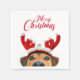 Ótima ilustração de animais de Natal, Feliz, com um cão curioso vestindo uma faixa de cabelo de rena. Cartões de natal sazonal escrito em letras tipográficas modernas.