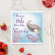 Este bonitinho e bonito guardanapo de comemoração de aniversário apresenta um ilustrado sob o tema do mar com uma bela sereia flutuando no canto. A sereia apresenta cabelos castanhos longos e fluidos com listras de roxo e chalé. A cauda dela é roxa com sotaques de chá e ouro. A fronteira apresenta um padrão de água desbotado para ilustrar a sereia nadando sob o mar. A fonte é impressa em uma elegante cor roxa.