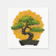 Uma bela ilustração de uma árvore bonsai que se senta num pote preto contra um fundo circular amarelo brilhante.