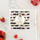 Torne o seu evento especial com estes guardanapos de papel personalizados com a foto carregada e 4 linhas de texto personalizado rodeado por uma borda dourada elegante e colocado contra um padrão de listras pretas e brancas, rosas cor-de-rosa, margaridas e borboletas douradas. Perfeito para aniversários, chá de bebê e de noiva, aposentadorias, aniversários de casamento ou realmente qualquer dia.