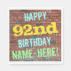 Este divertido design de guardanapo de papel, tema de aniversário, apresenta uma mensagem como "FELIZ 92º ANIVERSÁRIO, NOME AQUI!", onde o nome pode ser personalizado. O fundo apresenta uma representação de uma parede de tijolos constituída por alguns tijolos de cor castanha avermelhada. O texto de mensagem personalizável apresenta cores como azul, amarelo e verde, e tem uma aparência inspirada pela do grafite pintado. Napkins como estes poderia talvez ser usado numa festa de aniversário para alguém que comemora seu nonagésimo segundo aniversário. [~Z0000271]