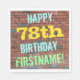 Este divertido design de guardanapo de papel, tema de aniversário, apresenta uma mensagem como "FELIZ 78º ANIVERSÁRIO, FIRSTNAME!", onde o nome pode ser personalizado. O fundo apresenta uma representação de uma parede de tijolos constituída por alguns tijolos de cor castanha avermelhada. O texto de mensagem personalizável apresenta cores como azul, amarelo e verde, e tem uma aparência inspirada pela do grafite pintado. Napkins como estes poderia talvez ser usado numa festa de aniversário para alguém que comemora seus setenta e oito anos. [~Z0000271]