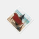 Uma bruxa com um chapéu largo sentado num sofá de veludo vermelho virado para as ondas do oceano, com uma vassoura e um par de botas deitadas na areia ao seu lado