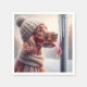 Um cachorro do Irish Setter vestindo um chapéu de tricô e um cachecol tem sua língua rosa presa a um poste de metal gelado.