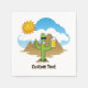 Cartoon de cacto sorridente com óculos de sol na paisagem desértica segurando uma caneca de cerveja e dando polegares para cima. Texto personalizado.