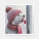 Um cão branco fofo com um chapéu vermelho e cachecol tem a língua presa a um poste de metal gelado no Natal.