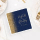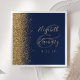 A borda esquerda desses elegantes guardanapos de casamento modernos apresenta um design de brilho dourado. O texto personalizável combina letras douradas e fontes de impressão coloridas sobre um grande e sobre um fundo azul marinho.