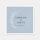 Este guardanapo apresenta um simples design acentuado com um gráfico de uma coroa branca de folhas com folhas sobre um fundo azul leve e empoeirado. Personalize com os nomes da noiva e do noivo e sua data de casamento.