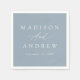 Simples, caligrafia, guardanapos de casamento com seus nomes e data de casamento em letras brancas com um fundo azul empoeirado. Os guardanapos azuis são perfeitos para usar para sua recepção de casamento, janto de ensaio, festa de noivado e muito mais! Os elegantes guardanapos de casamento foram projetados para coordenar com a nossa coleção de casamentos Elegante de Calligrafia Dusty Blue.