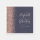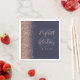 A borda esquerda desses elegantes guardanapos de casamento modernos apresenta um rosa dourado faux glitter design. O texto personalizável combina letras rosa pálidas e fontes de impressão coloridas sobre um grande painel e sobre um fundo azul escuro.
