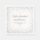 Elegantes guardanapos de papel branco com brilho prateado para recepção de casamento com texto, "Decidimos para sempre." e espaço para adicionar os nomes dos noivos e data do casamento.