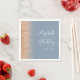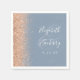 A borda esquerda desses elegantes guardanapos de casamento modernos apresenta um design de brilho de pêssego. O texto personalizável combina a escrita manual branca e as fontes em copperplate sobre um grande painel e sobre um fundo azul empoeirado.