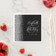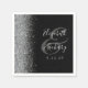 A borda esquerda desses elegantes guardanapos de casamento modernos apresenta um design de cintilação de prata. O texto personalizável combina a escrita manual de cinzas prateadas e as fontes de impressão em um grande painel e em um fundo preto.