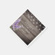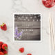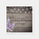 Guardanapos de casamento rústico chic personalizados com textura de madeira ao fundo, luzes de corda, flores de lavanda roxa e um modelo de casamento que é facilmente personalizado.