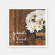 Adicione um toque de charme à decoração do seu chá de panela casual, mas clássico, de festa de celeiro ou da recepção de casamentos fazendas com o Balde de Wooden e o Livro de Casamentos do Carão de Brancos Brancos. Estes guardanapos descartáveis do estilo rancho ocidental rústico têm uma fotografia floral acesa de um balde de madeira cheio de flores margaridas brancas com um fundo de madeira castanho.