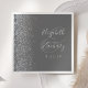 A borda esquerda desses elegantes guardanapos de casamento modernos apresenta um design de cintilação de prata. O texto personalizável combina a escrita manual de cinzas pálidas e as fontes de impressão em um grande e grande plano de fundo de uma cinza.