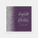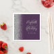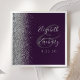 A borda esquerda desses elegantes guardanapos de casamento modernos apresenta um design de cintilação de prata. O texto personalizável combina a escrita manual de cinzas prateadas e as fontes de impressão sobre um grande painel e sobre um fundo roxo escuro.