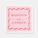 Adicione um toque de na moda à sua recepção de casamento, janto de ensaio, festa de noivado ou chá de casamento com estes guardanapos de casamento do Modern Pink e do Red Wavy Frame. Os guardanapos retro exibem os nomes dos casais em letras vermelho em negrito cercado por uma borda vermelha ondulada contrastando com um fundo rosa. Os guardanapos de casamento da moda foram projetados para coordenar com a nossa coleção de casamento do Modern Wavy Frame.