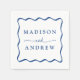 Adicione um toque de na moda à sua recepção de casamento, janto de ensaio, festa de noivado ou chá de casamento com estes guardanapos de casamento do Quadro Azul Moderno. Os guardanapos retro exibem os nomes dos casais em letras azuis em negrito cercadas por uma borda azul ondulada contrastando com um fundo branco. Os guardanapos de casamento da moda foram projetados para coordenar com a nossa coleção de casamento do Modern Wavy Frame.