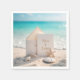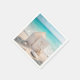 Um cartão de vazio e um envelope descansam em uma praia arenosa cercada por conchas, estrelas-do-mar e fundo oceânico turquesa. Todo o texto pode ser alterado.