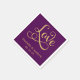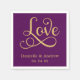O design de guardanapo recepção de casamento apresenta um design de roteiro decorativo de cor ouro "Love" com monograma personalizado que inclui os nomes de noiva e noiva e a data do casamento. A cor de fundo roxa pode ser personalizada para coordenar com o seu esquema de cor do casamento.
