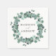Elegante, guardanapos botânicos com uma coroa de eucalipto verde e folhagem pintados à mão. Personalize os guardanapos de casamento do eucalipto adicionando seus nomes. Projetado para coordenar com a nossa coleção de casamentos de Eucalyptus Greenery Moderno.