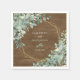 Perfeito para casamentos com temas da natureza, estes guardanapos de papel botânico de cor d'água rústica apresentam buquês de eucalipto verde decorando a estrutura geométrica dourada em torno dos nomes da noiva e do noivo e da data do casamento, com um fundo de madeira marrom rústica.