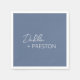 Os modernos guardanapos azuis com um design simples e mínimo com o nome da noiva em um roteiro elegante e o nome do noivo em uma fonte contemporânea sans serif. Estes guardanapos de estilo minimalista são uma adição de excelente à sua recepção de casamento, festa de noivado ou chá de panela.