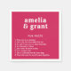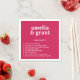 Os guardanapos de casamento ao estilo moderno, com um esquema simples e mínimo com os seus nomes numa fonte retrógrada e uma lista de fatos divertidos sobre a noiva e o noivo. O esquema de cores brilhantes é vibrante Viva Magenta rosa. As fontes/cores podem ser alteradas na ferramenta de edição de design. Estes fatos divertidos guardanapos adicionam um elemento divertido à sua recepção de casamento, festa de noivado ou chá de panela.