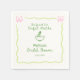 Guardanapos de casamento com 'Ela Encontrou Seu Matcha Perfeito' apresentando uma moldura de rabiscos suave em verde e rosa com laços, uma ilustração fofa de uma tigela de matcha desenhada à mão e uma fonte manuscrita excêntrica.