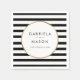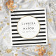 Com um clássico fundo listrado preto e branco, estes elegantes guardanapos de papel para casamento apresentam uma borda elegante em folha de ouro falso emoldurando seus nomes e data especial definidos em tipografia chic. Desenhado por Thisisnotme©