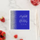 A borda esquerda desses elegantes guardanapos de casamento modernos apresenta um design de cintilação de prata. O texto personalizável combina letras brancas e fontes compactas sobre um grande e sobre um fundo azul real.