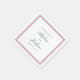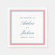 Estes guardanapos de cocktail apresentam uma simples borda de linhas marinho azuis e rosa que enquadram nomes de casais elegantes e fáceis de personalizar e texto de datas de casamento com muito espaço branco leve e arejado para aquele olhar sofisticado em linha com o novo estilo tradicional do milênio.