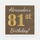 Este simples design de guardanapo de papel apresenta uma mensagem como "Aniversário de 81ruas de Alexandre!", com as "81ruas" a terem uma aparência falsa de ouro, num fundo castanho. O nome pode ser personalizado. Pode ser usado em uma festa de aniversário para alguém que comemora seu oitenta aniversário. [~Z0000082]