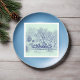 Cena de inverno vitoriana - imagem gráfica em tons azuis frios. Apresenta um trenó desenhado por cavalos com árvores nuas.