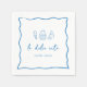 Este lindo design de chá de panela inspirado na Itália apresenta letras cursivas em estilo manuscrito acentuadas com uma borda de fita ondulada em azul solar. Ilustrações desenhadas à mão de gelato, um cupcake e uma pastelaria completam o design para um visual de verão da Costa Amalfitana. Estas guardanapos elegantes para chá de panela mediterrâneo apresentam "la dolce vita" em letra manuscrita com os nomes do casal abaixo.
