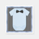 Guardanapos de chá de bebê menino com camisa azul bebê e gravata borboleta preta em um fundo de listras cinza e preto. Você pode personalizar esses guardanapos de chá de bebê menino adicionando simplesmente o texto no estilo de fonte e cor de sua escolha.