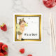 Guardanapos de chá de bebê abelha com um menino de cabelo escuro fofo vestindo um adorável traje de abelha em um fundo preto e dourado com abelhas zumbindo. Você pode adicionar o texto de sua escolha para personalizar este guardanapo de chá de bebê de abelha.