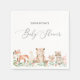 Rapazes chás de fraldas bonitos com cores aquáticas pintados com animais da floresta vestindo flores cor-de-rosa em uma floresta juntamente com o "Chá de fraldas" em uma letra de escrita caprichosa. Estes guardanapos rústicos de chá de fraldas podem ser personalizados adicionando o nome da futura mãe.