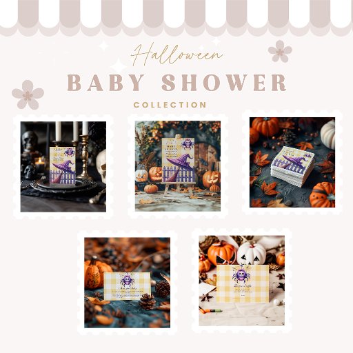Celebre o seu bico com este charmoso design de Halloween! Apresentando um fundo aconchegante de gingham, um chapéu de bruxa roxo, vassoura de madeira e uma aranha amarrada ao arco pendurada sobre uma cerca de piquete, este convite mistura-se assustador com doce de todas as formas. Perfeito para um cheio de calor e mágica de outono.