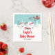 Este bonitinho e divertido guardanapo de chá de fraldas apresenta uma adorável família de raposa-árctica em um cenário maravilhoso de inverno com árvores cobertas de neve e um pássaro vermelho em um galho com Holly. As raposas de Santa Hats adicionam um toque festivo. Ao fundo está um céu verde azul teal e flocos de neve caindo. O texto combina fontes decorativas e sans serif para um aspecto na moda e moderno. Isto é perfeito para um chá de fraldas temático de Natal.