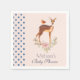 Guardanapos de papel com um veado castanho bonito com um dorso branco. Um passarinho sentado nas costas do veado. Um buquê floral rico com rosas de aquarelas e folhas verdes-oliva claras sob os pés dos veados. Uma borda de bolinhas azul ao longo do lado. Inocente e doce design com elegância rústica. Pêssego fundo colorido. Personalize com um nome e evento.
