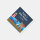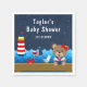 Este guardanapo bonito e divertido apresenta um urso marinheiro náutico num convés de madeira com uma gaivota e um caranguejo. Ao fundo há um farol vermelho e branco, um pássaro giro em um veleiro, ondas oceânicas e um céu azul marinho estrelado à noite. O texto combina fontes em negrito e sem serifa para uma aparência na moda e moderna. Isto é perfeito para um chá de fraldas temático náutico.