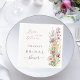 Um fundo branco chic. Decorado com flores silvestres em rosa, roxo, amarelo. Personalize e adicione o nome da futura noiva. Texto: O amor está florescendo.