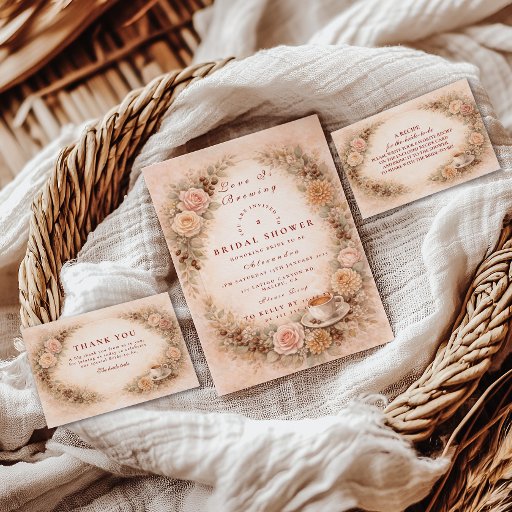Aconchegante, romântico e incrivelmente acolhedor, este design de chá de panela inspirado em café apresenta rosas cor-de-rosa, grãos de café e um charmoso detalhe de cappuccino sobre um fundo de pergaminho envelhecido. Os tons ricos de caramelo e chocolate criam uma atmosfera acolhedora de café, perfeita para celebrações de outono ou encontros de brunch. A tipografia elegante equilibra o calor rústico, tornando-o ideal para amantes de café e noivas que adoram detalhes íntimos e charmosos. Uma escolha linda para uma celebração de casamento de outono repleta de amor e lattes.